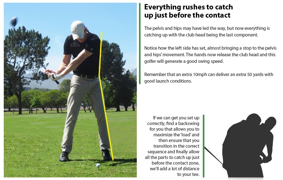 In the search for extra distance, we have looked at your backswing and how to load up (noting some mistakes to avoid); then we looked at the transition and how to make sure you start that with the right body sequence. If you get that right then you can add a lot of club head speed. Carry the right sequence through to the contact zone and you will see great results.