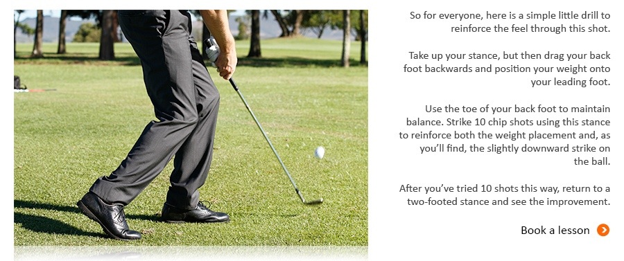 Here is a health check to run on your chip shot. Check on your weight distribution at setup and through the shot. At address it ought to be about 60 % on your front foot (left foot for right handers) and stay there throughout your swing. Even the best golfers can get into the habit of allowing weight distribution to even out at address or to transfer weight through this shot.